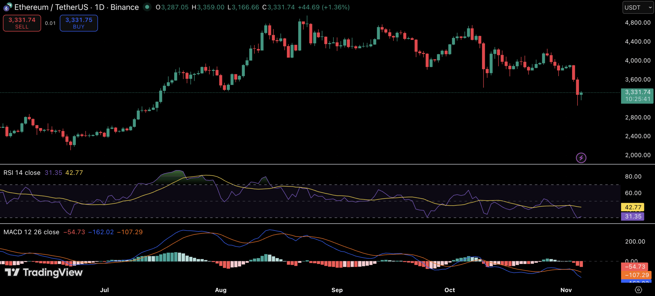 以太坊日线图显示,在连续数根阴线后卖压开始缓解。相对强弱指数(RSI)从近超卖区域反弹至43,MACD柱状图的红色柱体缩短,暗示看跌动能正在衰退。市场正试图从清除过度杠杆头寸的流动性危机中恢复,ETH价格目前在3,200至3,400美元区间波动——该区域与历史测试过的支撑位重合。若能明确突破3,400美元将视为复苏的首个信号,或为测试3,600-3,800美元阻力位打开空间。