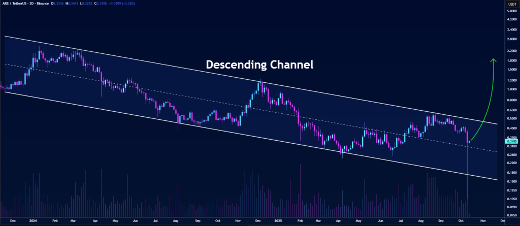 Arbitrum($ARB)自0.26美元反弹至0.345美元后,在下降通道结构内呈现企稳迹象。当前代币价格在中轨上方盘整,显示积累性买压与潜在多头延续动能。