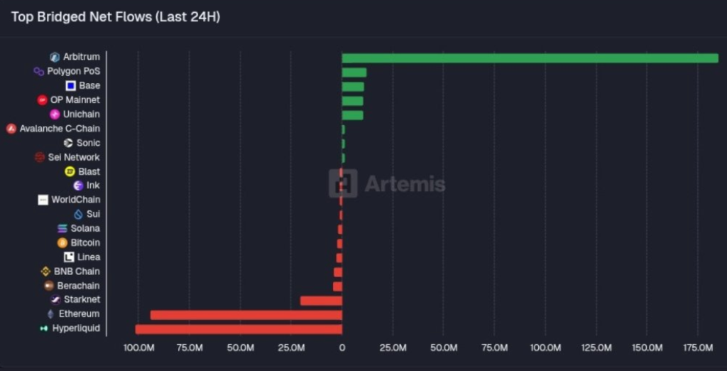 Artemis数据显示,过去24小时Arbitrum以7.06亿美元跨链资金净流入领跑所有公链,超越Base、Polygon等竞争对手。在以太坊与Hyperliquid活跃度下降背景下,Arbitrum成为新用户入驻首选Layer2。