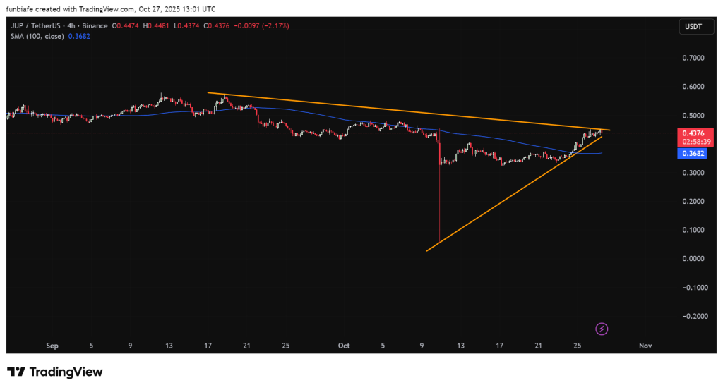 观察4小时图可见,JUP价格正在形成紧凑的上升三角形形态。这意味着价格持续测试0.45美元阻力位,而每次回撤的低点都在逐步抬高。