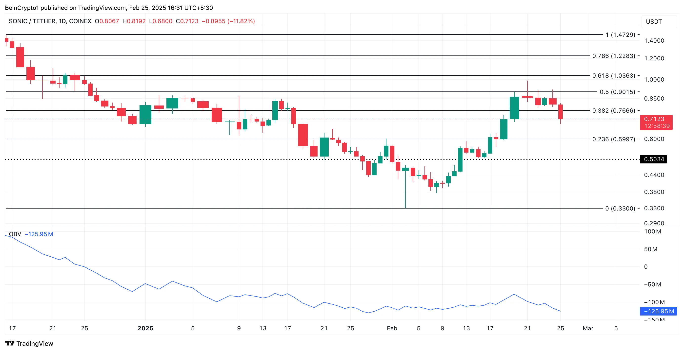 Sonic的S代币是今日另一热门山寨币。其价格下跌17%,反映出过去24小时整体市场的下跌趋势。S代币买盘压力的急剧下降也促成了这一价格下跌,其能量潮指标(OBV)的下降证实了这一点。该指标通过衡量资产的累计交易量来评估买卖压力。当指标下降时,表明卖压超过买压,可能预示着进一步的价格疲软或看跌趋势。如果抛售持续加强,S价格可能跌至0.59美元。