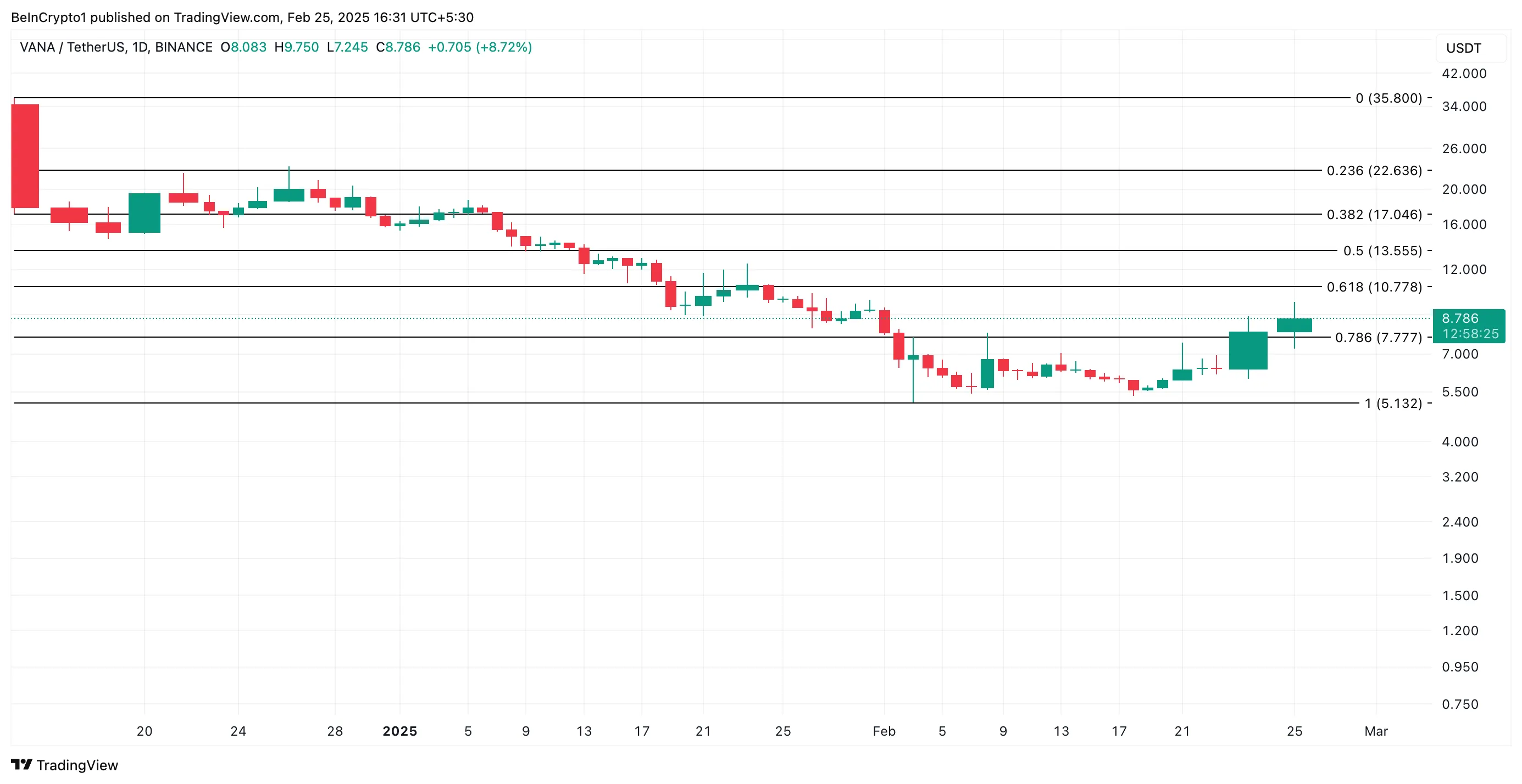 该公司证实,在品牌重塑后活跃于YZi Labs的赵长鹏(CZ)已作为交易的一部分加入Vana担任顾问。截至发稿时,VANA交易价格为8.78美元,过去24小时交易总额达6.39亿美元,期间增幅超过2800%。VANA交易量的大幅增长表明,当前涨势是由市场对该山寨币的需求驱动的。如果涨势持续,VANA价格可能触及10.77美元。