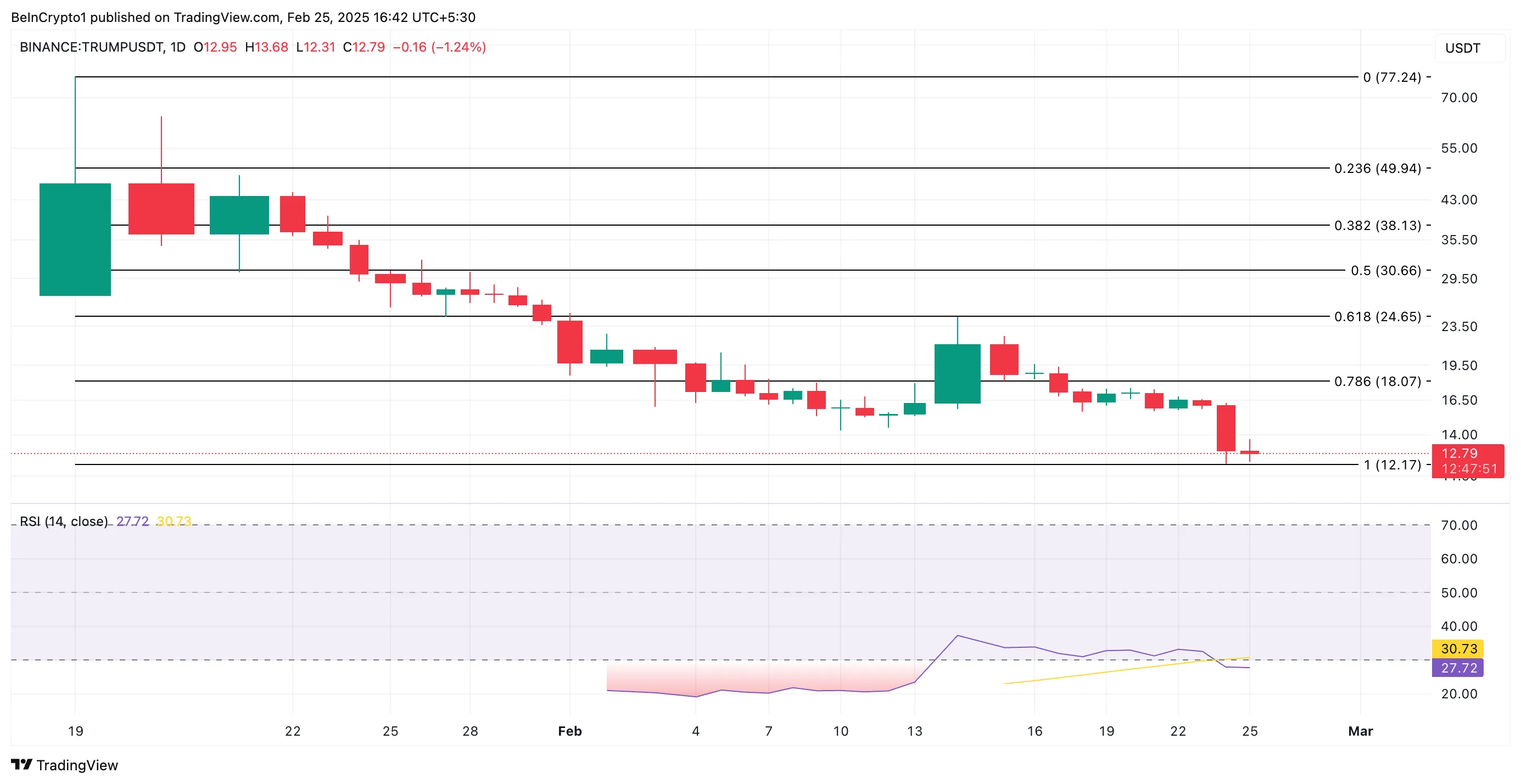 Official Trump(TRUMP)是今日搜索量最高的山寨币之一。其当前交易价格为12.78美元,过去24小时下跌14%。在过去一个月内,TRUMP已贬值55%,其相对强弱指数(RSI)读数显示,该资产可能即将迎来反弹。