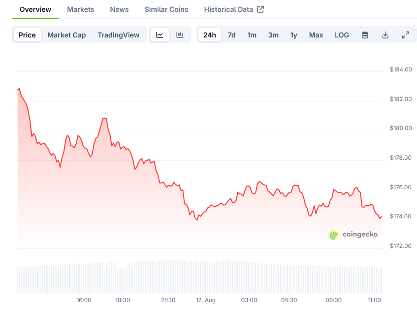 SOL当前交易价格在174.59-175.64美元区间,较历史高点下跌约40%