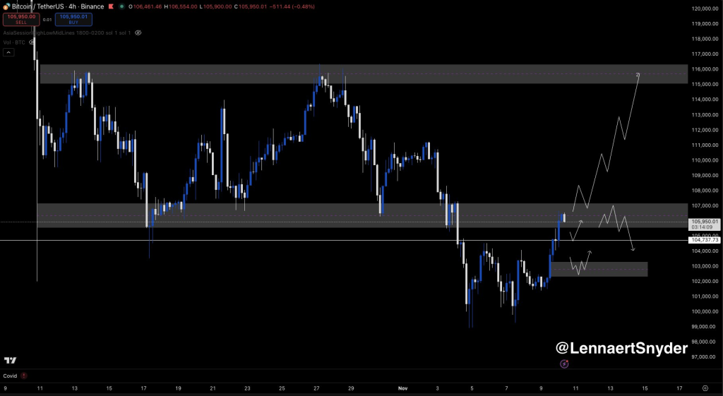 近期价格走势显示市场结构可能发生转变。107,200美元被视为关键阻力位,因其标志着前期导致价格下跌的区间低点。若成功收复该价位,或将测试历史压力位115,000美元区间高点。