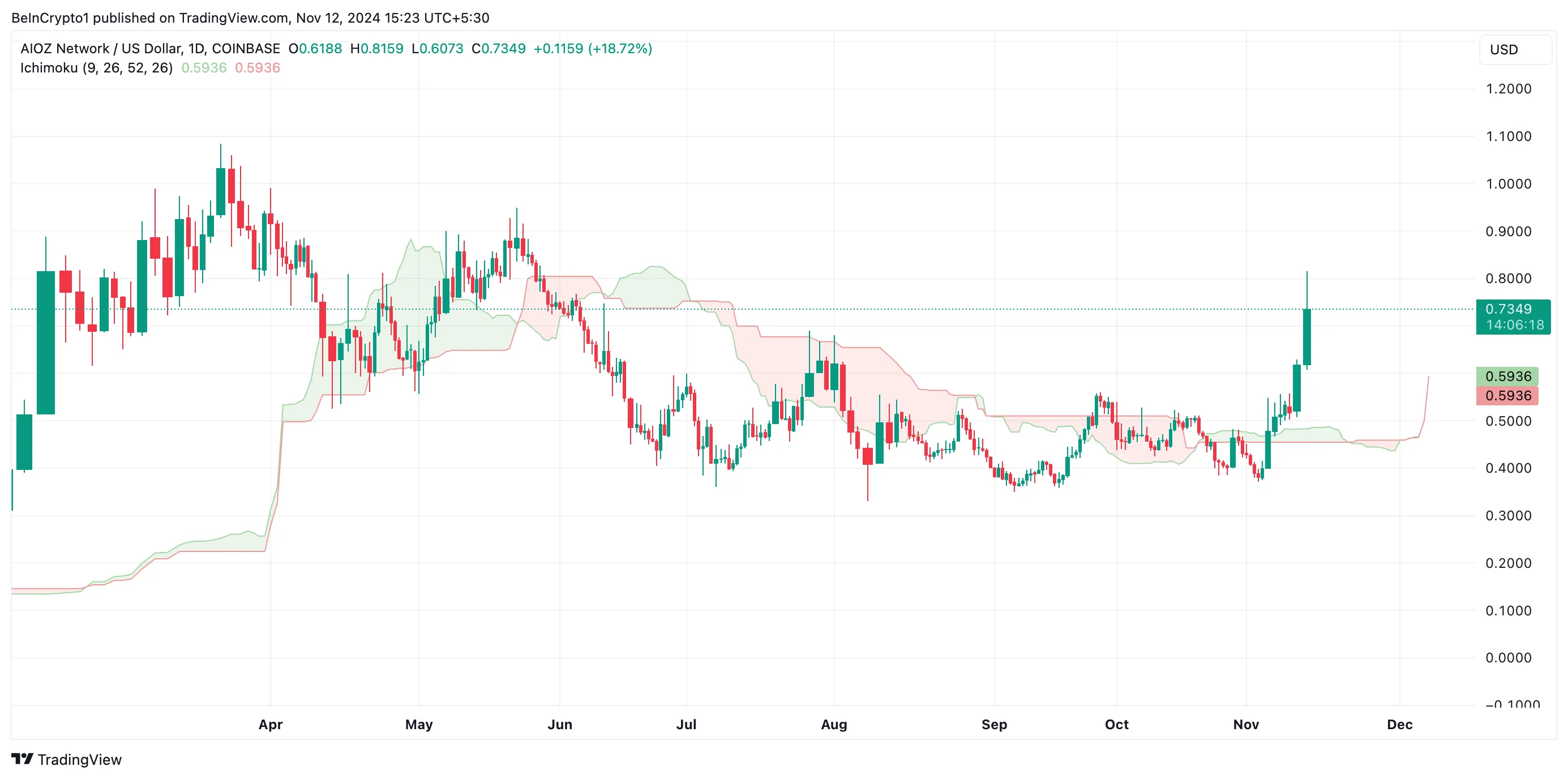 目前,AIOZ的价格已达到0.73美元。在这一价格水平上,该代币的交易价格位于其一目均衡云(Ichimoku Cloud)之上。一目均衡云用于追踪趋势动量并识别潜在的支撑/阻力位。当资产价格保持在云层之上时,通常预示着强劲的看涨趋势,表明买方占据主导地位,市场情绪积极。