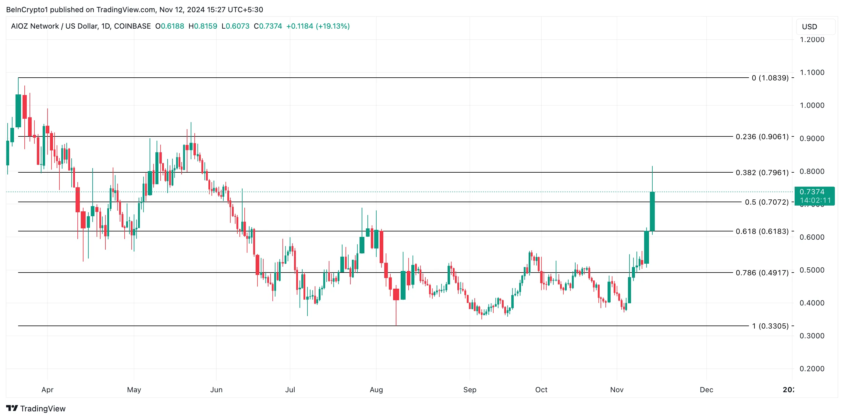 一旦买方动能耗尽,AIOZ可能会开始回吐近期涨幅。根据斐波那契回撤工具,预计其价格将回落至0.61美元的阻力位,这是其最近突破的水平。如果该水平未能守住支撑,AIOZ的价格可能会进一步下跌至0.49美元。