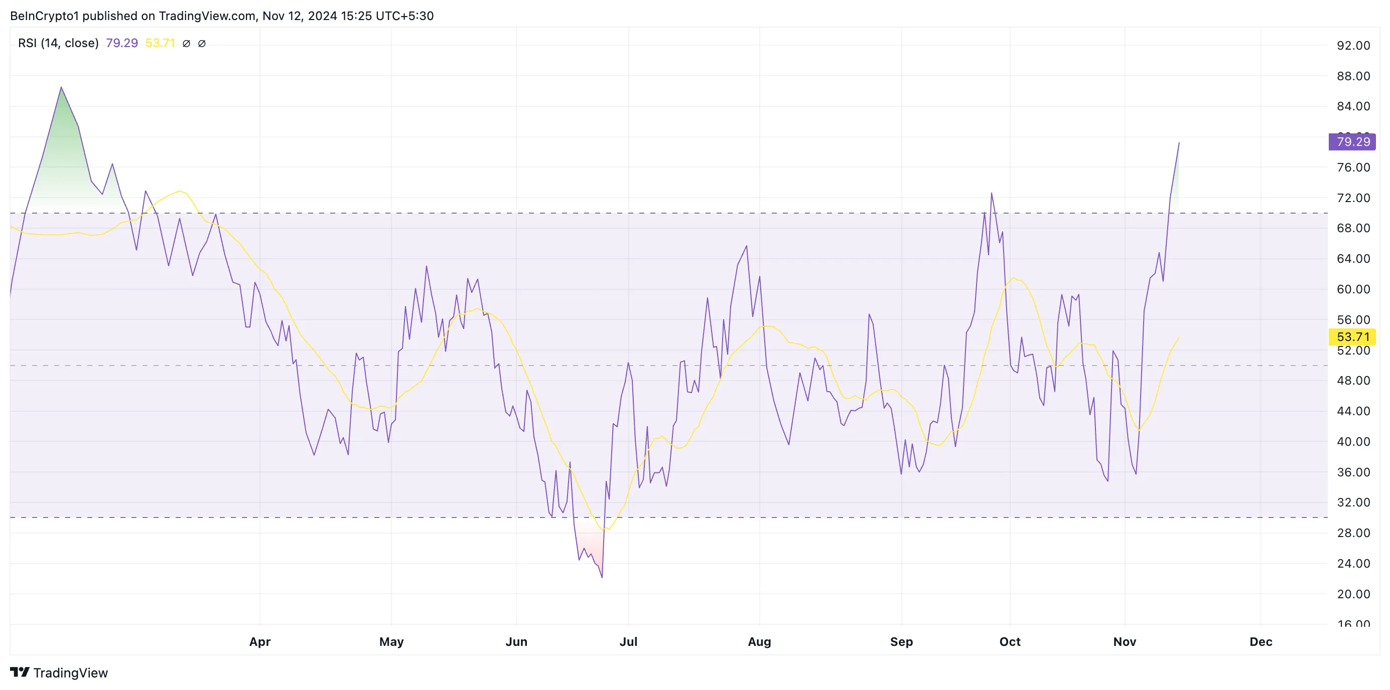 然而,随着AIOZ关键动量指标显示出超买信号,买方的动能可能即将耗尽。该代币的相对强弱指数(RSI)目前为79.29,仍处于上升趋势中。RSI指标用于衡量资产的市场超买和超卖状况,其范围从0到100。当RSI值高于70时,表明资产处于超买状态,可能面临回调;而低于30时则表明资产被超卖,可能出现反弹。79.86的RSI读数表明交易者已将AIOZ价格推得过高,随着买盘压力减弱,可能会出现回调或回撤。