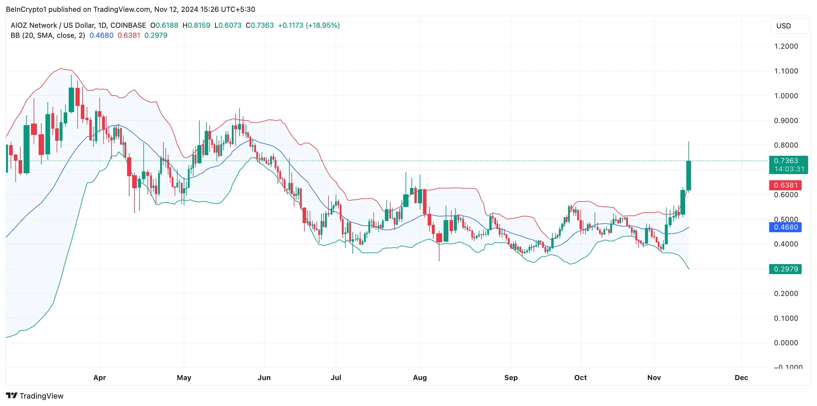 此外,AIOZ的价格位于其布林带指标的上轨之上,进一步确认了其超买状态。布林带指标用于衡量资产的市场波动性,并突出潜在的买入和卖出信号。它由三个主要部分组成:中轨、上轨和下轨。当资产价格突破上轨时,表明资产处于超买状态,可能已经过度延伸。交易者通常将此视为可能出现下行压力的信号,从而促使他们卖出以锁定利润。