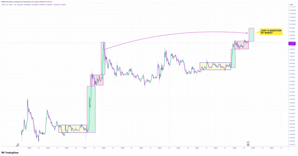 不过分析师CRYPTOWZRD通过历史周期对比指出,XRP正在复刻2017年"牛市"轨迹。根据其分析,瑞波币需突破3.65美元阻力位才能维持上升趋势。一旦突破该点位,价格有望冲击4.50美元目标位。这些看涨观点恰与市场对加密货币"十月行情"的期待形成共振。