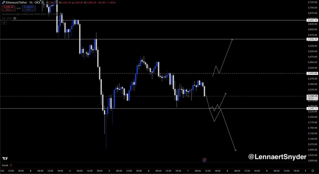 分析师Lennaert Snyder在近期社交平台发文中警告:若3200美元支撑位失守,ETH可能进一步下探。当前ETH已跌破3350美元关键支撑,加剧市场担忧情绪。Snyder特别指出:"在重新站上3400美元阻力位前,我不会考虑做多。"