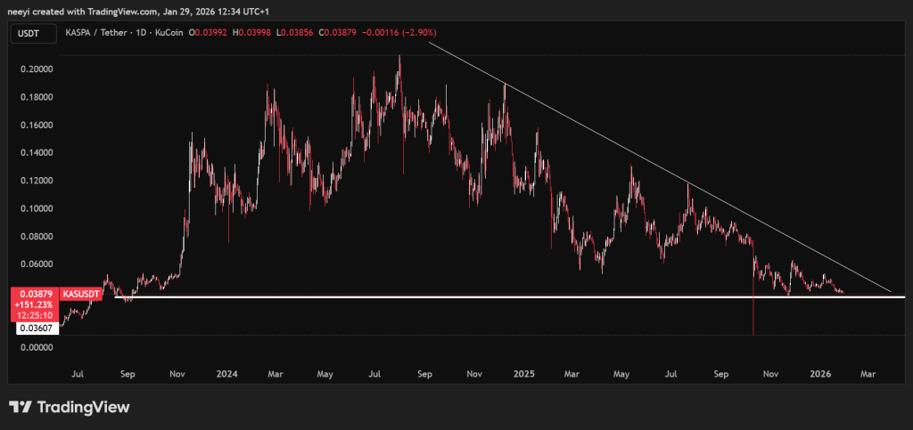 截至一月收盘,Kaspa价格已跌破前期整理区间,在日线图上确认了另一个更低的高点。目前价格正徘徊于长期测试的0.036美元水平支撑位上方,该位置在历次抛售中曾多次充当底部屏障。虽然买方曾试图捍卫这一防线,但随着反弹幅度逐渐缩小且力度减弱,防守效能已日益衰微。