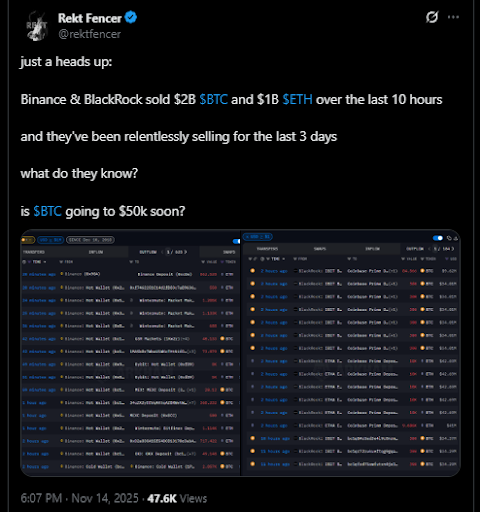链上分析师Rekt Fencer指出,币安与贝莱德在约十小时内合计抛售价值近10亿美元的ETH。这一数据直观展现了机构持币者在本交易时段的抛售规模。他补充说明,这两大实体在此窗口期前已持续减仓约三天。贝莱德的交易动向尤其受关注,因其早已确立为代币市场主要参与者。
