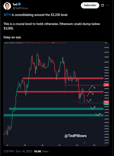 图表分析师TedPillows绘制了ETH在3200美元核心支撑区的即时结构图。他采用四小时与日线图表而非短期日内波动来构建框架。