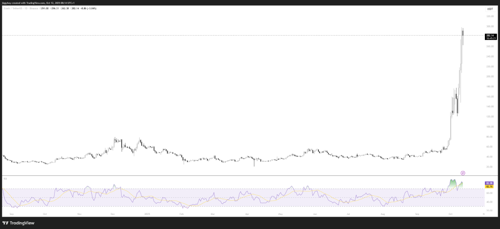 日线图上ZEC呈现抛物线走势,RSI达83显示超买,但在强牛市中可能持续数周。关键支撑位210美元,300美元心理关口成为焦点,突破后可能挑战350-400美元目标区。