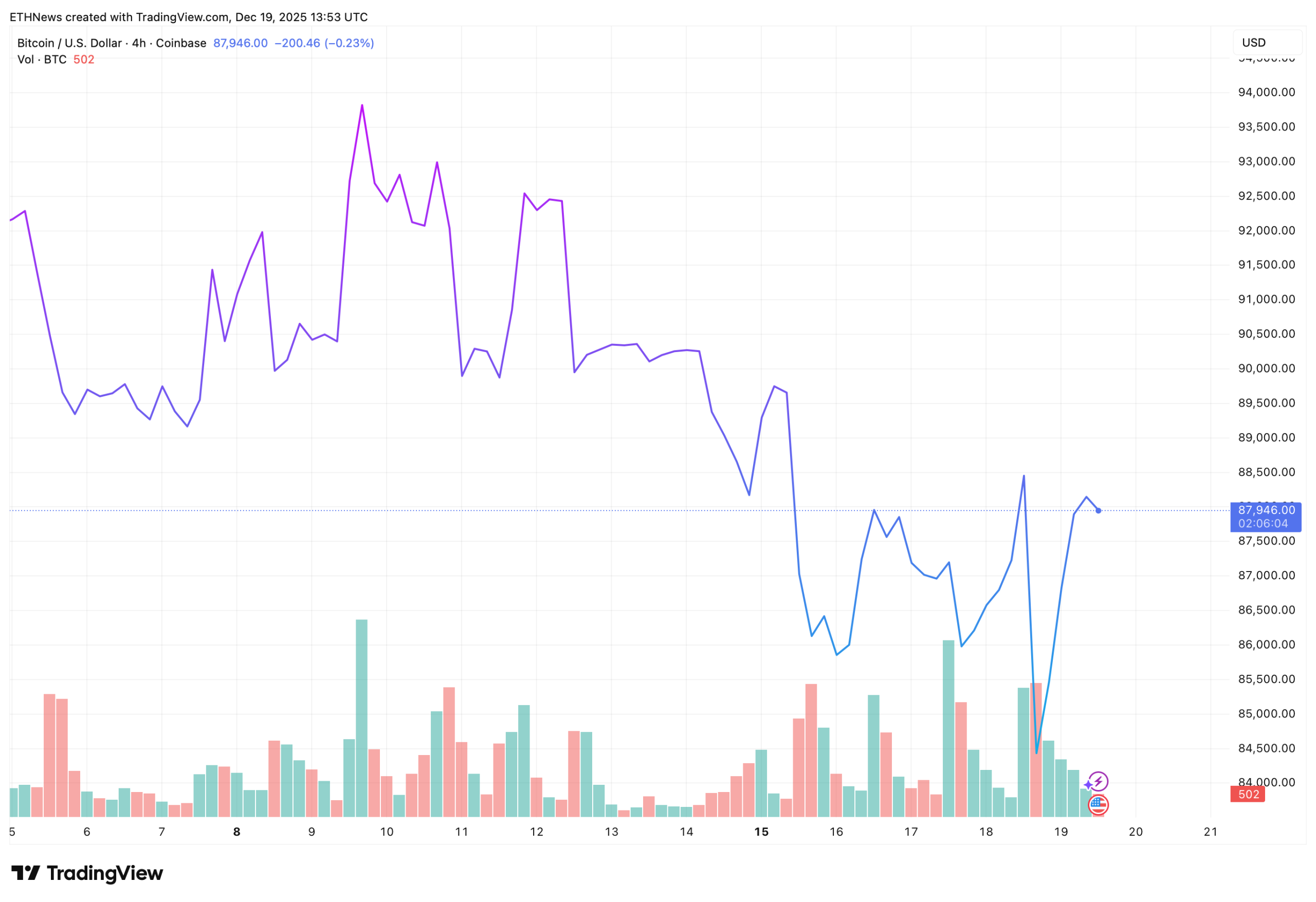 抛售与反弹期间成交量有所放大,但后续参与度迅速降温。价格此后稳定在87900美元附近,徘徊于可见阻力区下方而未能重获动能。此种行为反映的是反应性波动,而非趋势反转。