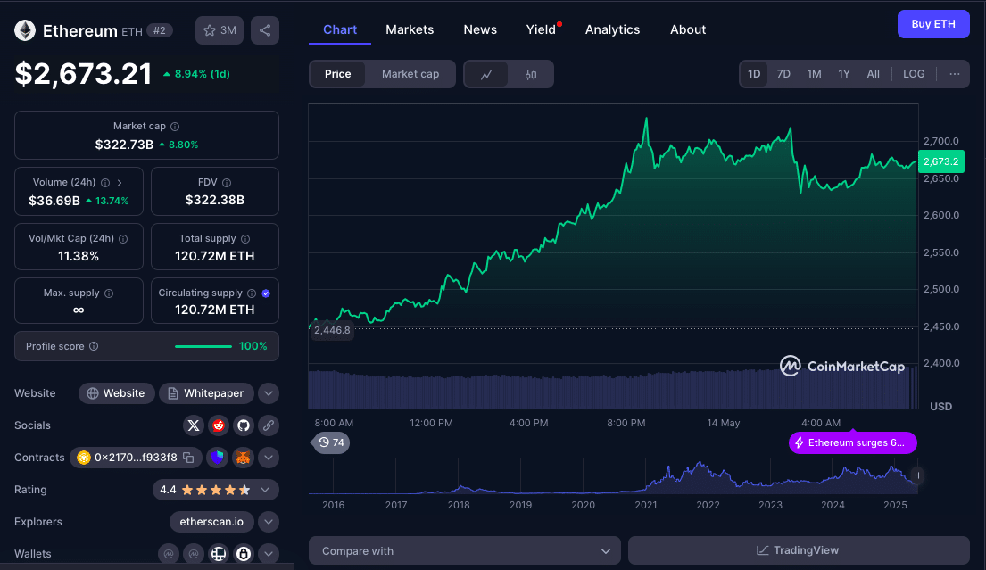 在Pectra升级之后,以太坊价格一路飙升,一周内涨幅接近50%。网络的最新升级,加上机构需求和宏观利好,使以太坊不仅成为顶级加密货币,更是目前全球最有价值的金融工具之一。截至5月14日,以太坊交易价格为2,673美元,仅比2月初埃里克·特朗普发推文时的高点低6%。根据TradingView数据,这是自2023年11月复苏以来以太坊最强劲的反弹。
