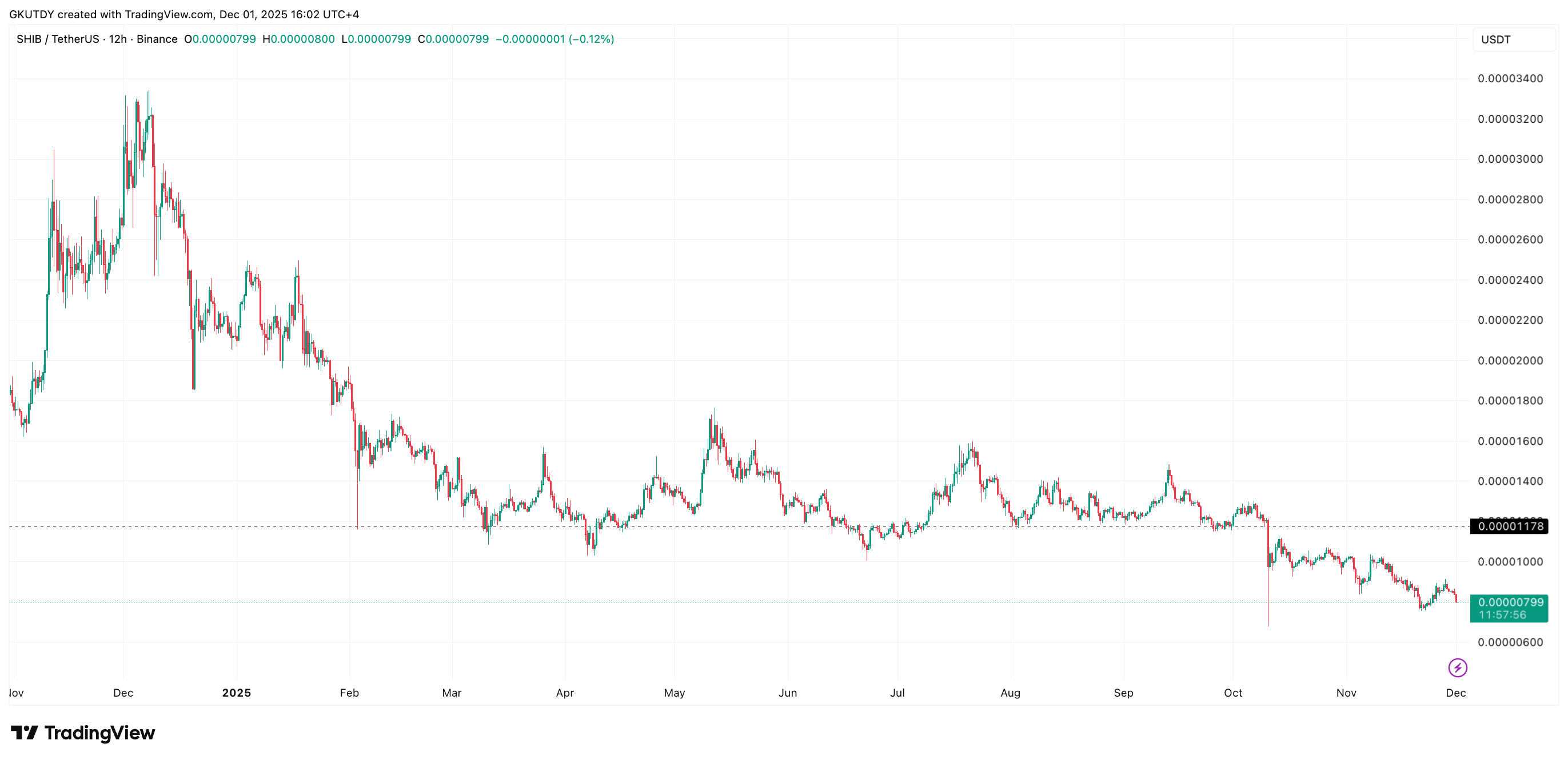 比特币以数周来最剧烈的月度转换开启12月行情,单日暴跌超5000美元后直逼86000美元关口。当BTC陷入停滞时,XRP却悄然创下其史上最大ETF资金流入记录——五日内吸金2.89亿美元,且实现于主流币种普遍下跌的一周。SHIB则从相反方向进入12月:价格徘徊在0.000008美元附近,市场结构薄弱,突破该区间的任何波动都至关重要。反弹可能使图表扭转数月来的跌势,但若跌破0.0000072美元,将使其陷入年度最弱势区间。