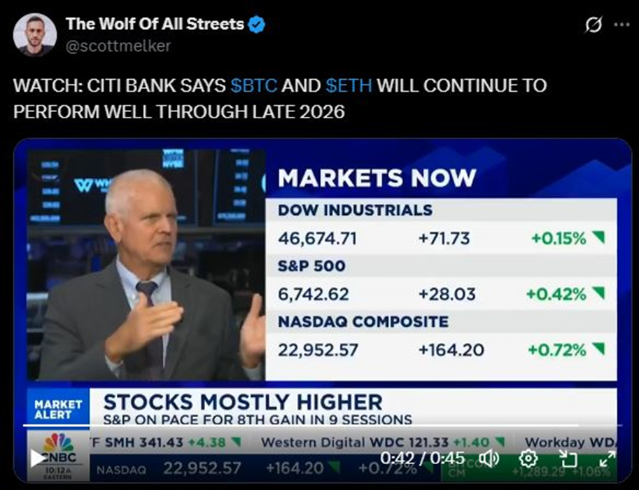 花旗银行近日出人意料地表示,其对比特币和以太坊维持看涨立场。据报道,该行预计这两种加密货币将保持整体上涨趋势直至2026年底。