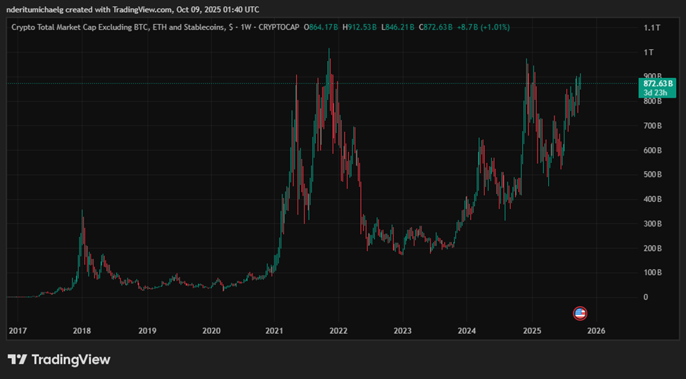 值得注意的是,排除以太坊和稳定币的山寨币总市值目前徘徊在8730亿美元左右,较2021年11月的历史峰值仅相差16%。