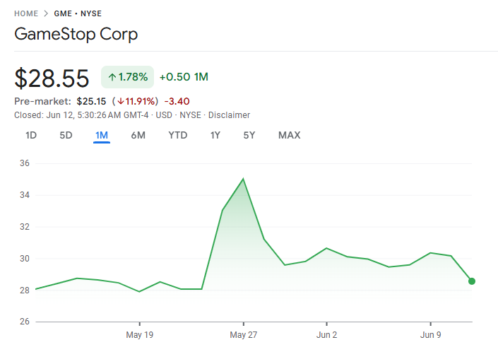 市场用脚投票的反应极为迅速:GameStop股价(GME)从30美元上方跌至28.50美元,较5月28日比特币购入消息公布时已累计下挫20%。2025财年第一季度财报更添压力——17%的营收同比跌幅(7.324亿美元vs上年同期8.818亿美元)大幅低于分析师预期。传统业务萎缩与加密货币战略的不确定性形成双重打击,严重动摇了投资者信心。