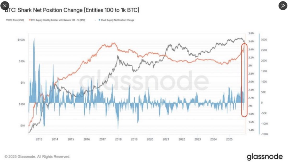更重要的是,强劲的吸筹现象表明重要市场参与者正在为预期中的复苏进行布局。近期大额持有者数据显示,持有100-1000枚BTC的巨鲸群体正在加速积累筹码。