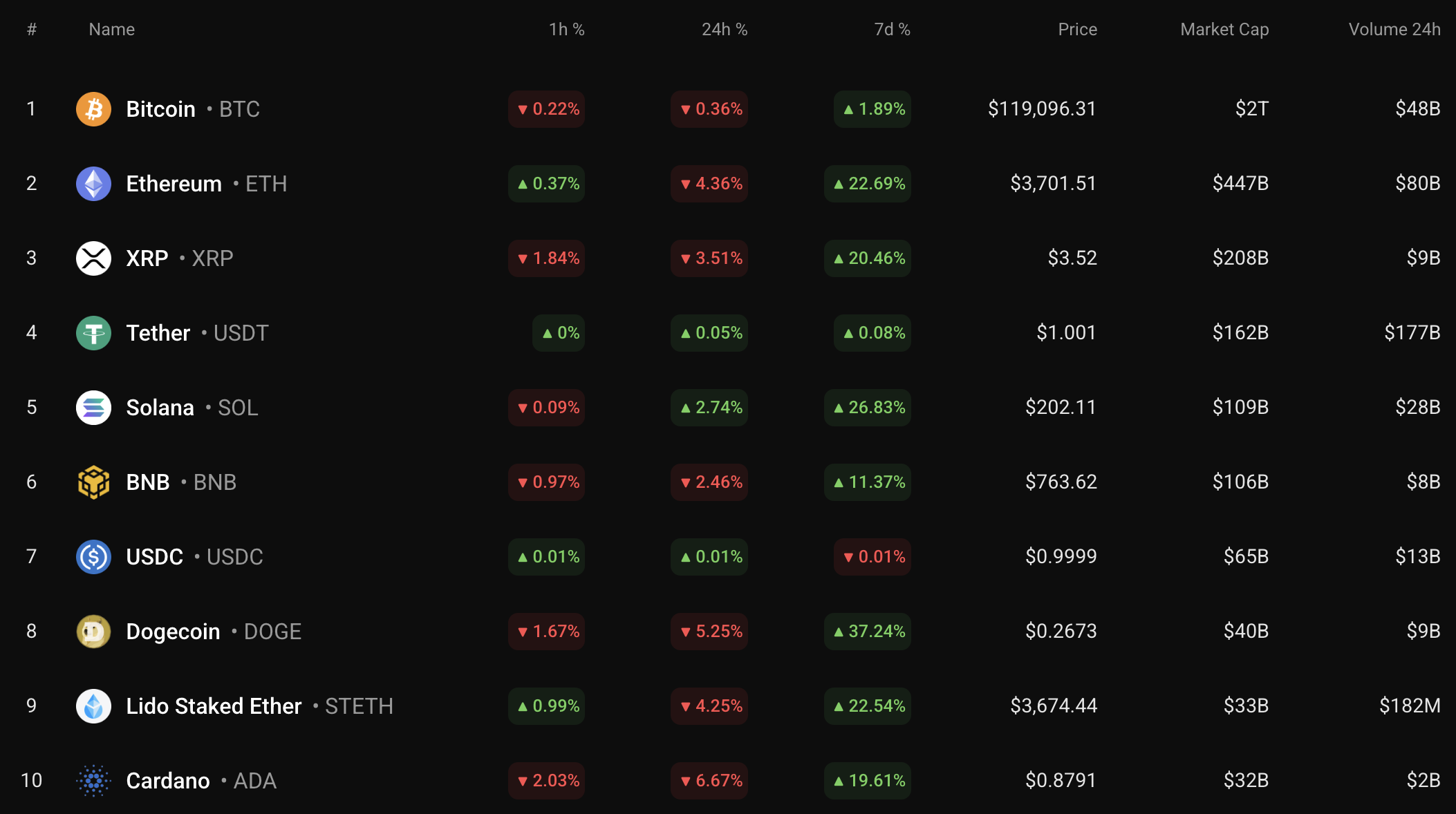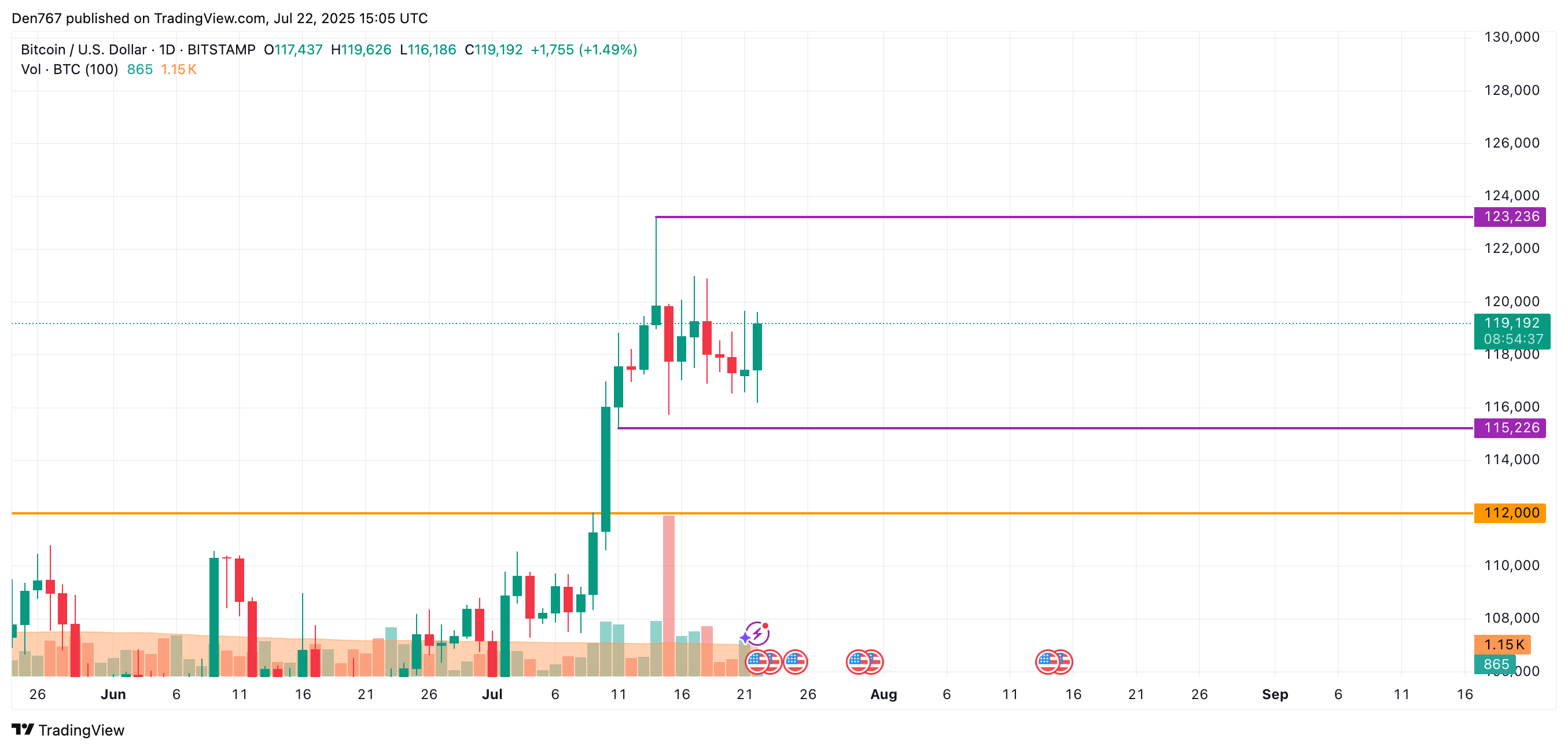 从日线图来看,买方形势相对不利。主流加密货币价格目前处于115,226美元支撑位与123,236美元阻力位构成的宽幅通道中段。由于多空双方势均力敌,最可能的情况是价格将在117,000-121,000美元区间维持横盘整理。