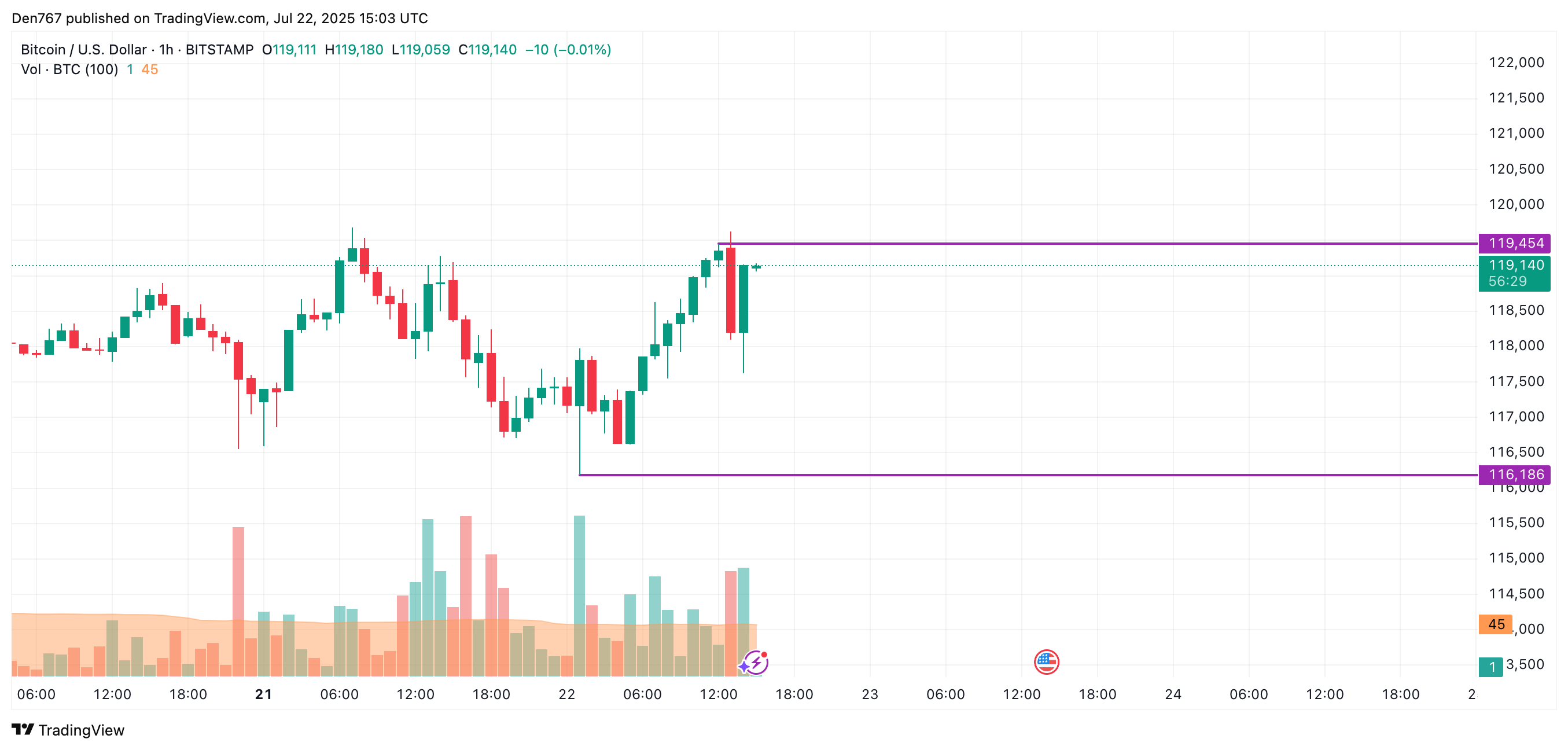 从小时线图观察,BTC价格走势呈现看涨态势,当前正蓄势测试局部阻力位。若成功突破,积累的能量或将推动价格测试120,000-121,000美元区间。
