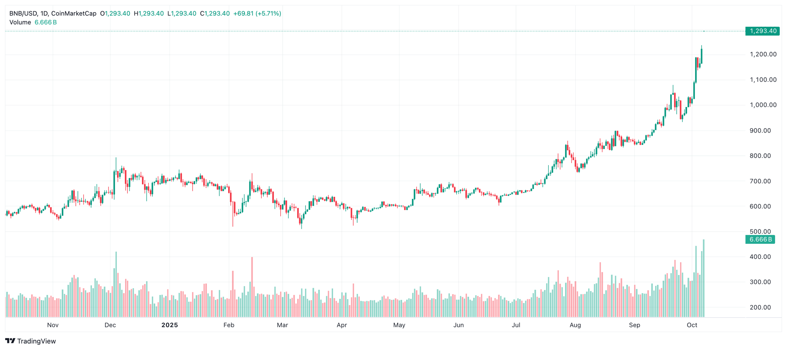 BNB今日再次刷新纪录,突破1280美元大关并逼近1300美元关口。此番价格走势源于BNB链用户数量增长及链上交易量上升的双重推动。在机构需求信号增强的时段,市场强烈的风险偏好为价格上涨注入动能。而区块链内去中心化交易所Aster的迅猛发展,则进一步推高了网络交易强度及链上锁定资产总值(TVL)。此外,网络团队宣布与Chainlink合作,将美国官方宏观经济数据接入区块链的举措,同样为这波涨势提供了支撑。
