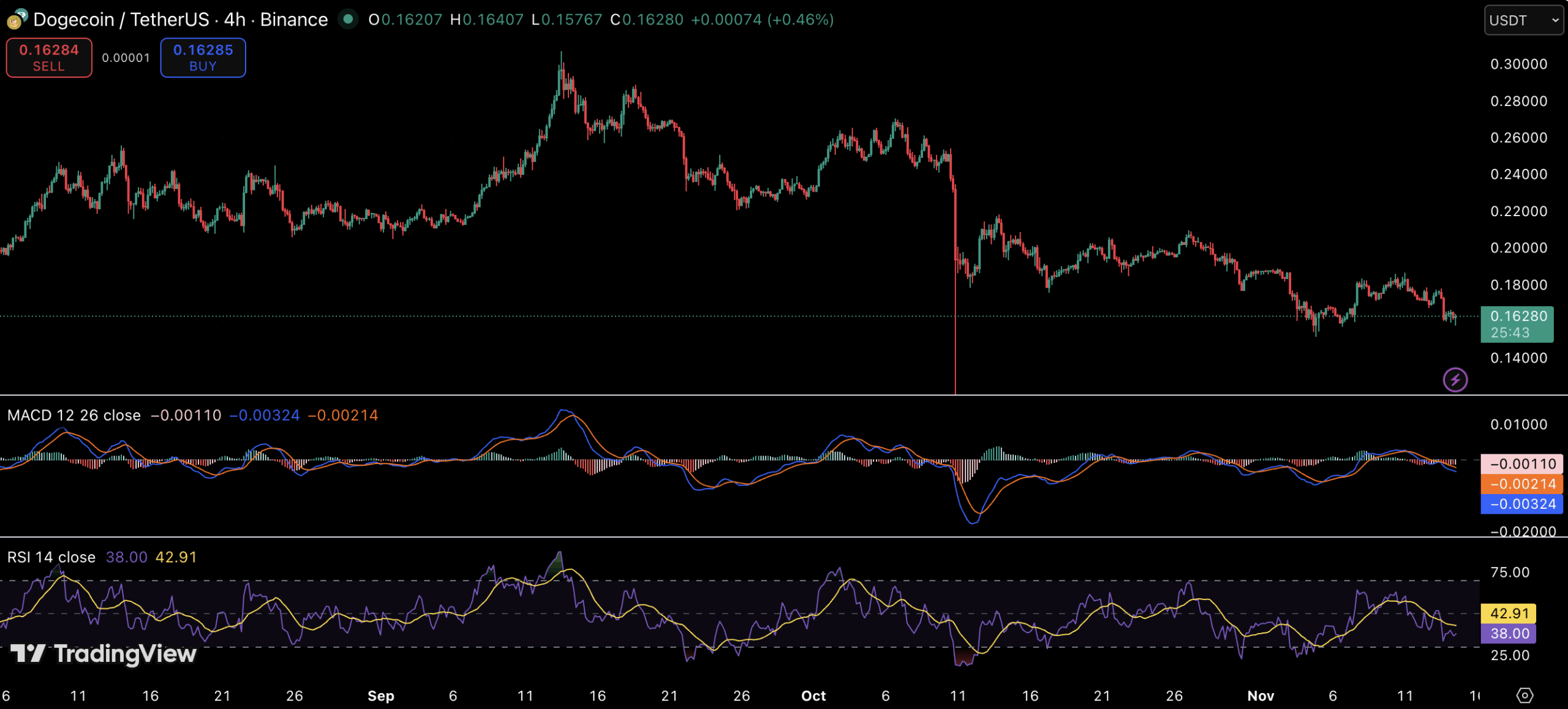 4小时图上,MACD仍低于信号线,而RSI(当前约38)未显示超卖反弹迹象。整体形态反映持续下跌趋势和投机买家热情消退。