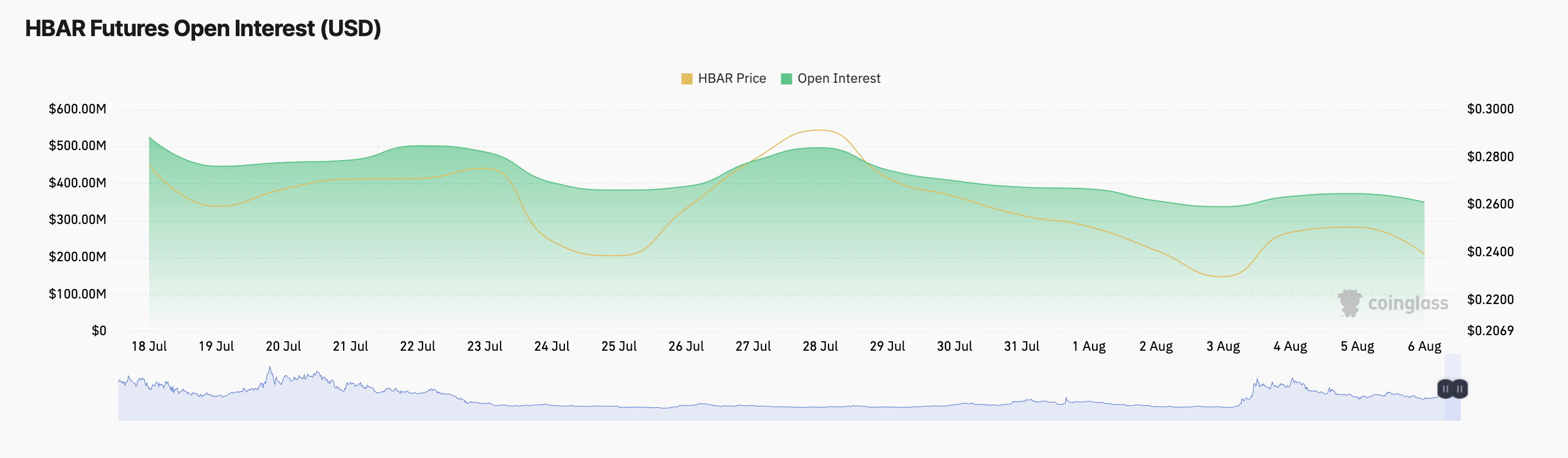 据Coinglass数据,HBAR期货未平仓合约骤降11%,当前仅余3.4935亿美元,表明衍生品交易者正在撤出看涨押注。