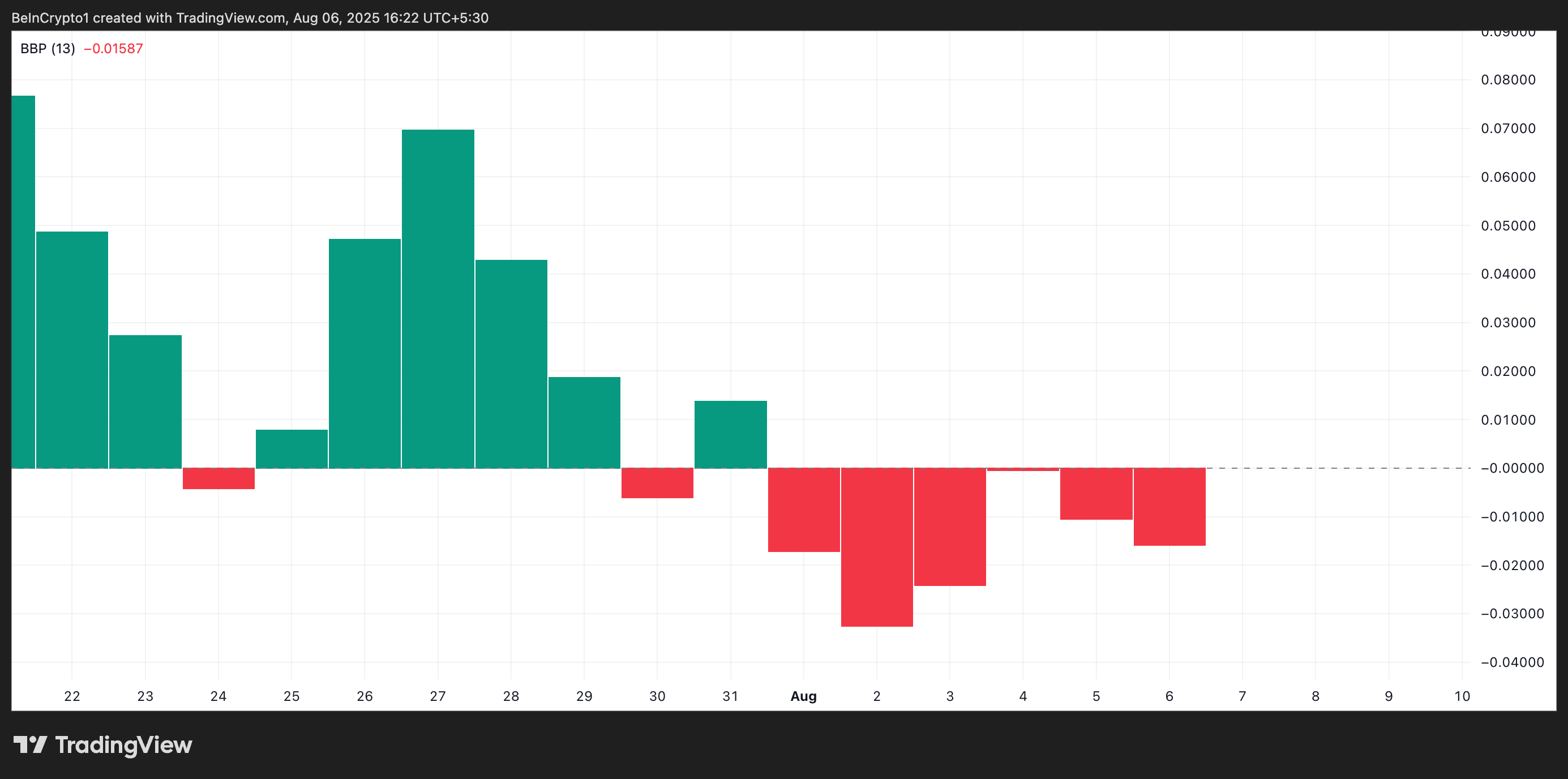 这种弱势同样体现在HBAR的Elder-Ray指数上——该指数在日线图上已连续六个交易日呈现负值。