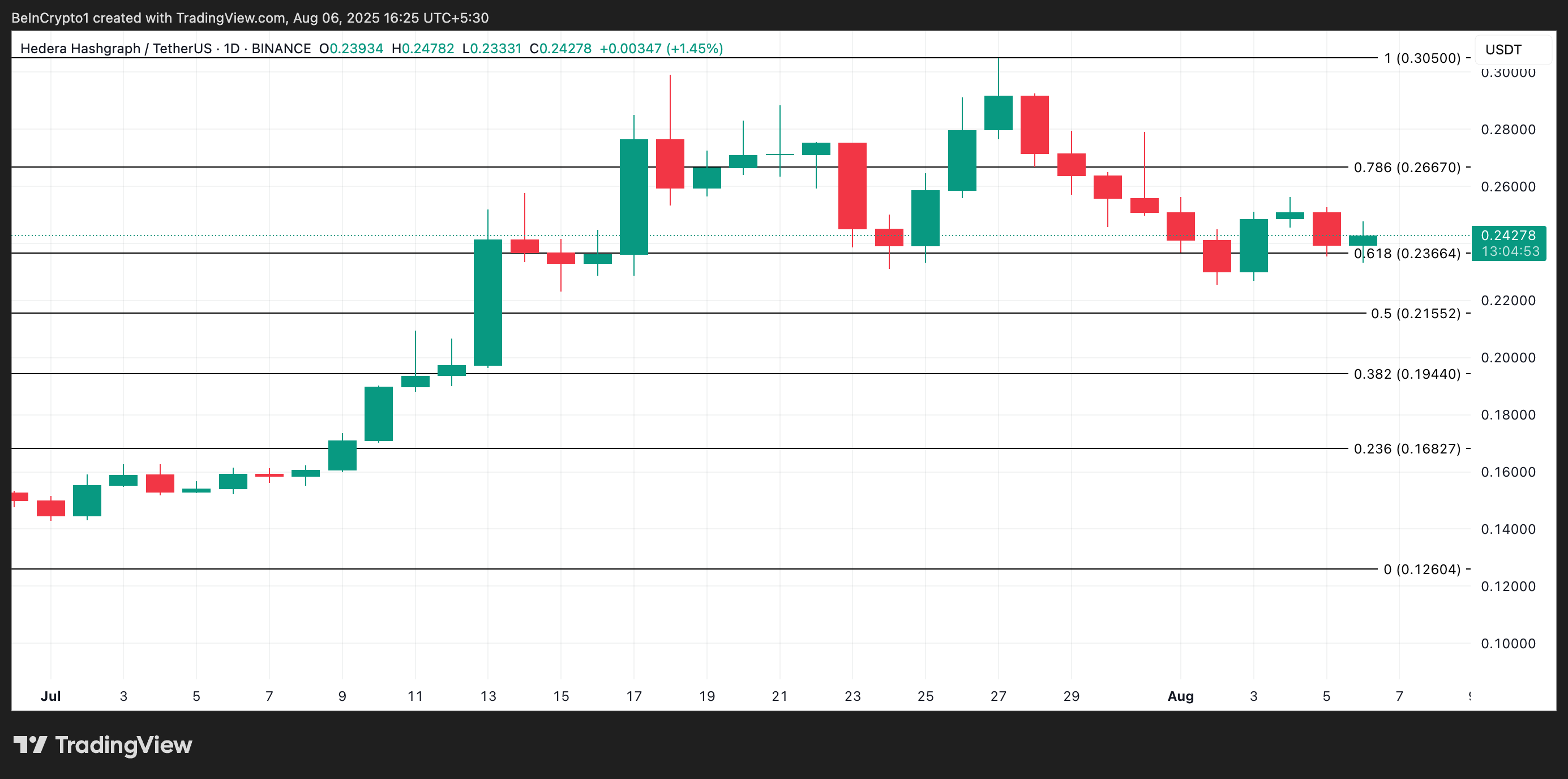 链上数据显示,随着交易者兴趣持续下降及现货市场积累势头减弱,HBAR价格可能在短期内跌破0.20美元。该代币自7月27日触及0.3050美元峰值后涨势乏力,截至发稿时报0.2427美元。