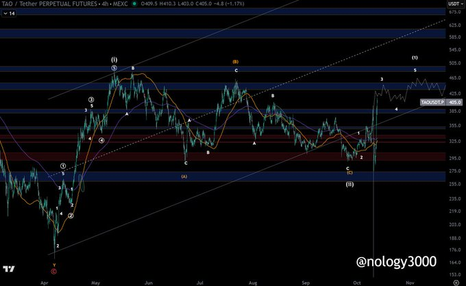 分析师认为$TAO正处于新推动浪的初始阶段,410-420美元区间可能成为下一浪的结构性基底,若动能持续将上看450-475美元区域。虽然短期可能在385-425美元区间震荡整固,但高低点逐步上移的形态配合均线金叉,显示多头仍掌控局面。