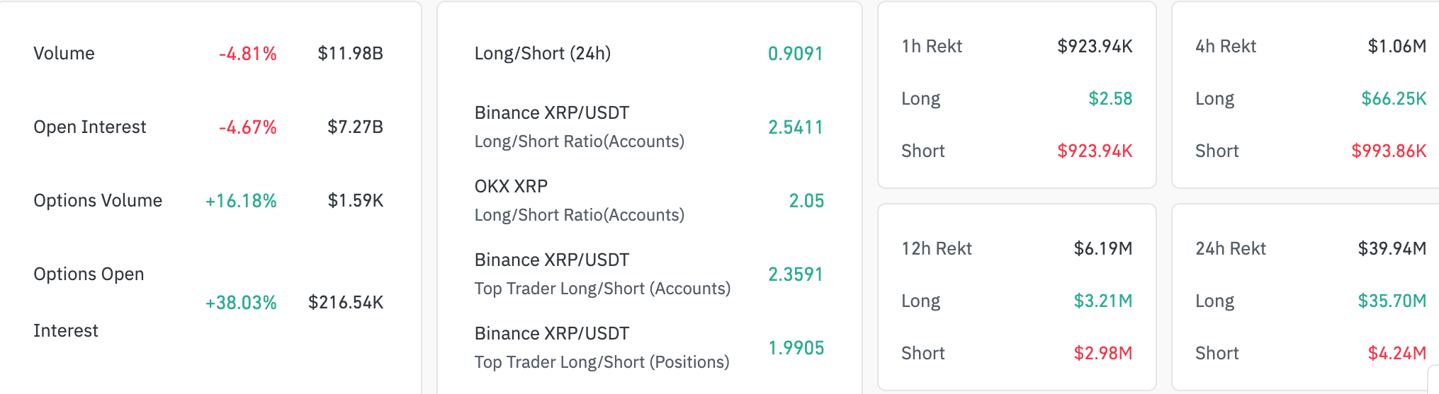 根据CoinMarketCap数据,在期货活动升温的同时,XRP现货交易量也上涨了12%。这表明交易者可能正在利用价格下跌的机会积累该代币。