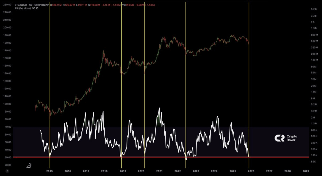BTC与黄金比率是重要参考指标。当该数值大幅下挫,意味着加密货币相对黄金走弱。目前该比率已进入“超卖区间”,即比特币相对黄金在短期内过快下跌。历史数据显示,类似区间往往接近长期底部,因此被众多交易员视为筑底信号。