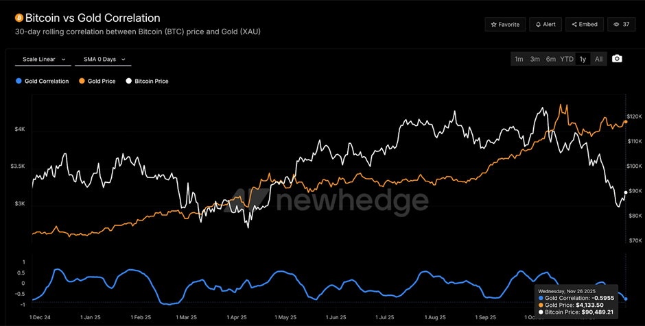 但还需观察两类资产的联动性。今年初比特币与黄金相关性曾高达0.76,表明二者同向波动;当前相关值已降至-0.59,呈现反向走势特征。