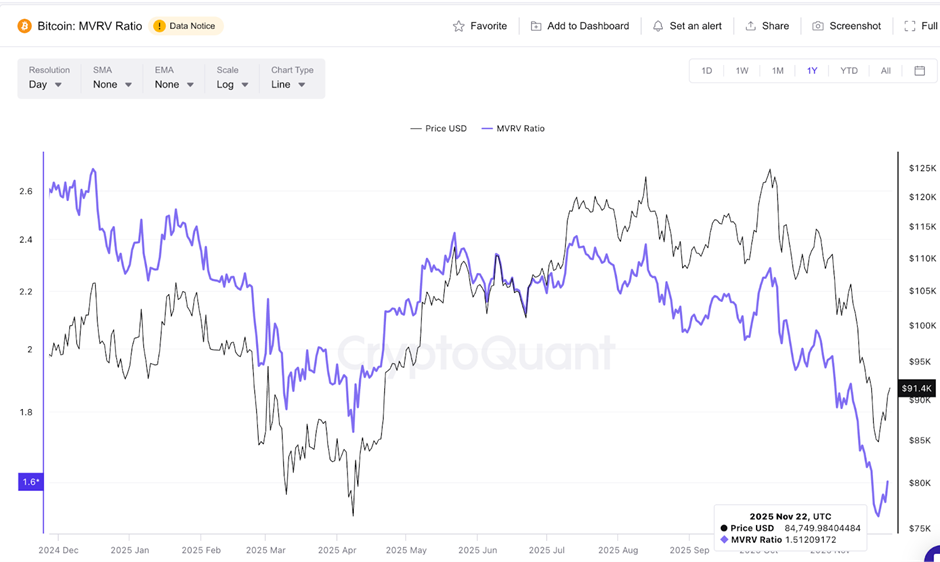 该指标通过对比现价与链上移动平均成本反映持有者盈亏。当MVRV处于高位意味大量持有者盈利丰厚,低位则接近亏损临界。11月末MVRV下探1.51后回升至1.60,相较于近年数据处于低位区间,表明比特币价格已低于本轮牛市多数时段。