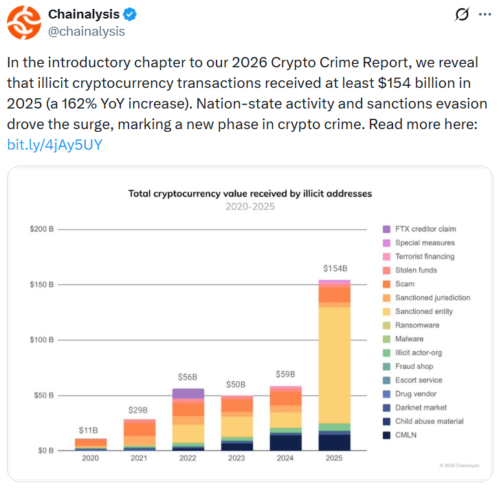去年针对民族国家的持续制裁推动非法地址接收的加密货币总值达到历史最高水平,被列入黑名单的实体试图大规模规避制裁。区块链分析公司Chainalysis在周四发布的2026年加密货币犯罪报告中指出,整个2025年出现了"与民族国家链上行为相关的空前交易量"。