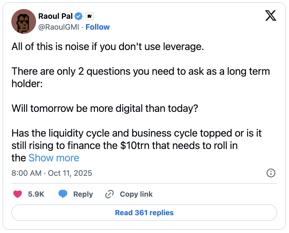 帕尔建议长期投资者不必恐慌,强调"明天的数字化程度将超越今天",指出数字资产的持久价值。他断言区块链和人工智能技术将继续在金融交易中扮演核心角色。此外,他提及全球流动性周期正处于上升轨道,预测各国央行及政府增加的货币供应将有力支撑加密货币市场。