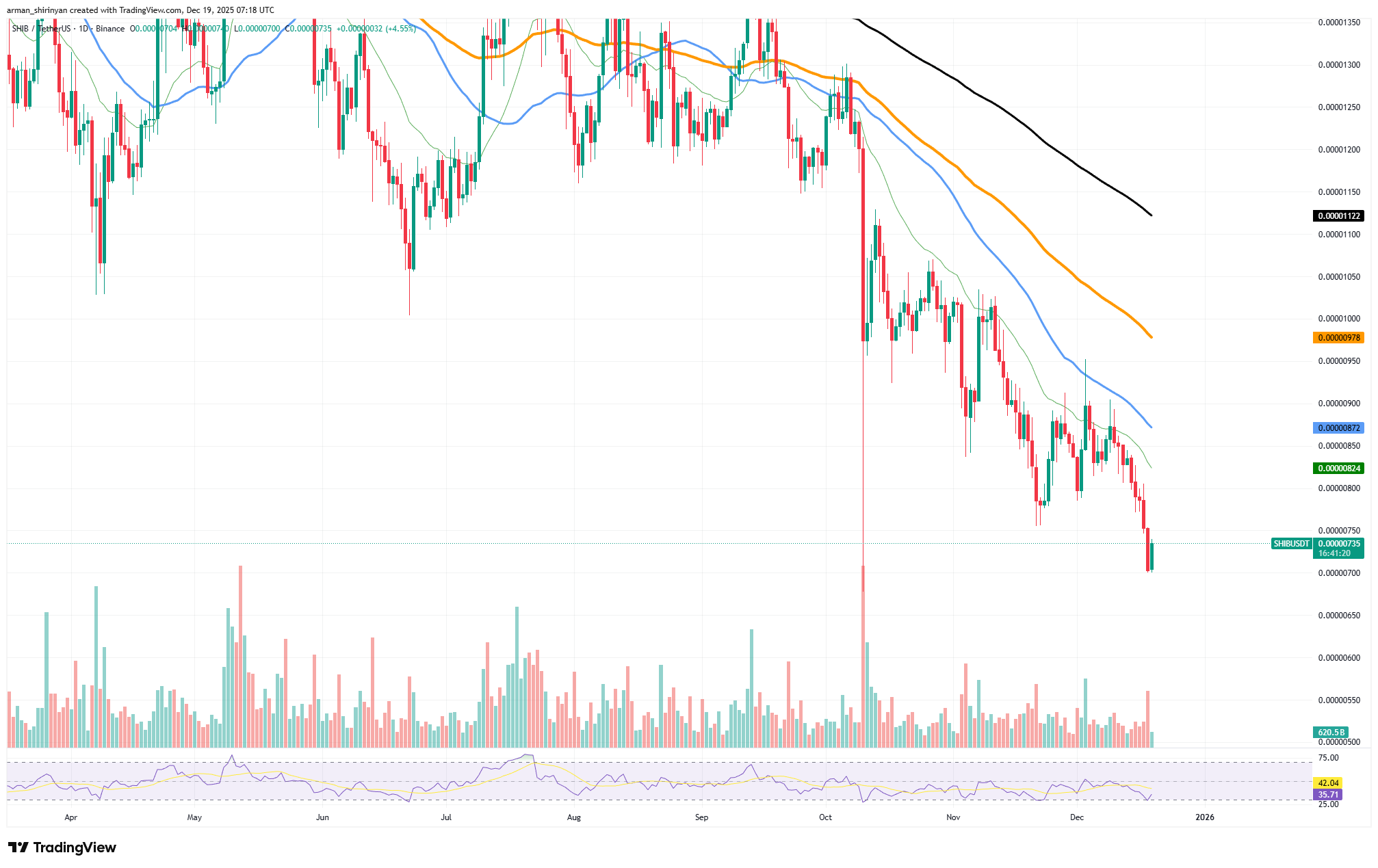 从更长时间框架看,SHIB仍处于稳步下跌通道。长期结构尚未修复,价格仍处于所有关键移动均线下方。不过动能指标已显现疲态。