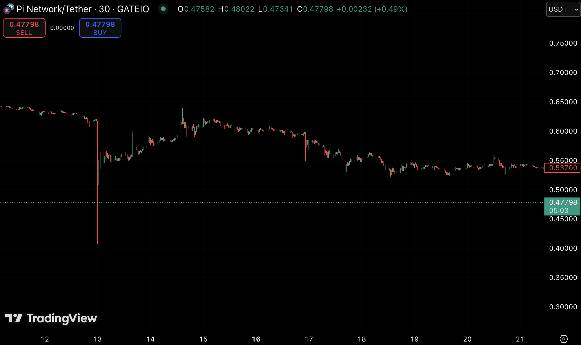 来自Gate.io等平台的数据显示,Pi/USDT当前交易价格约为0.47798美元,这一显著下跌标志着该项目面临关键转折点。图表呈现的价格走势揭示了6月13日前后的剧烈下滑,Pi币价值从约0.60-0.65美元的交易区间急剧跌落,进入新的更低整理区间。尽管近期出现+0.49%的微小涨幅,但远不足以抵消导致该资产跌至关键水平的大幅贬值。持续的下跌压力表明,市场可能正经历强劲的抛售活动,或对尚处于特殊发展阶段资产的普遍质疑。