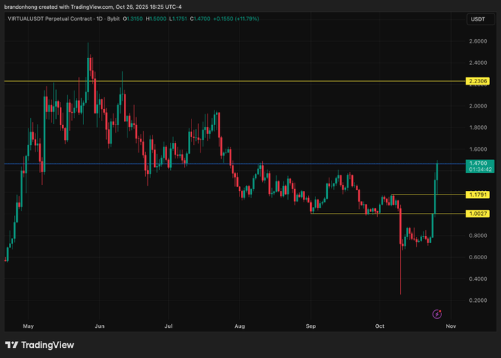 分析师Brandon Hong指出,VIRTUAL价格五个月来首次形成更高高点,预示趋势可能反转。日线图显示价格已突破1.00美元和1.18美元关键阻力位,当前在1.55美元下方整固。