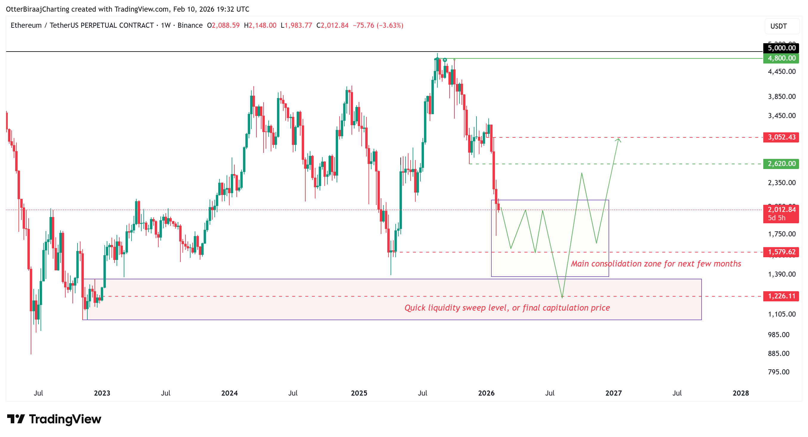 在周线图上,ETH跌向1,730美元区域更类似于其“首个低点”,而非确定的底部。