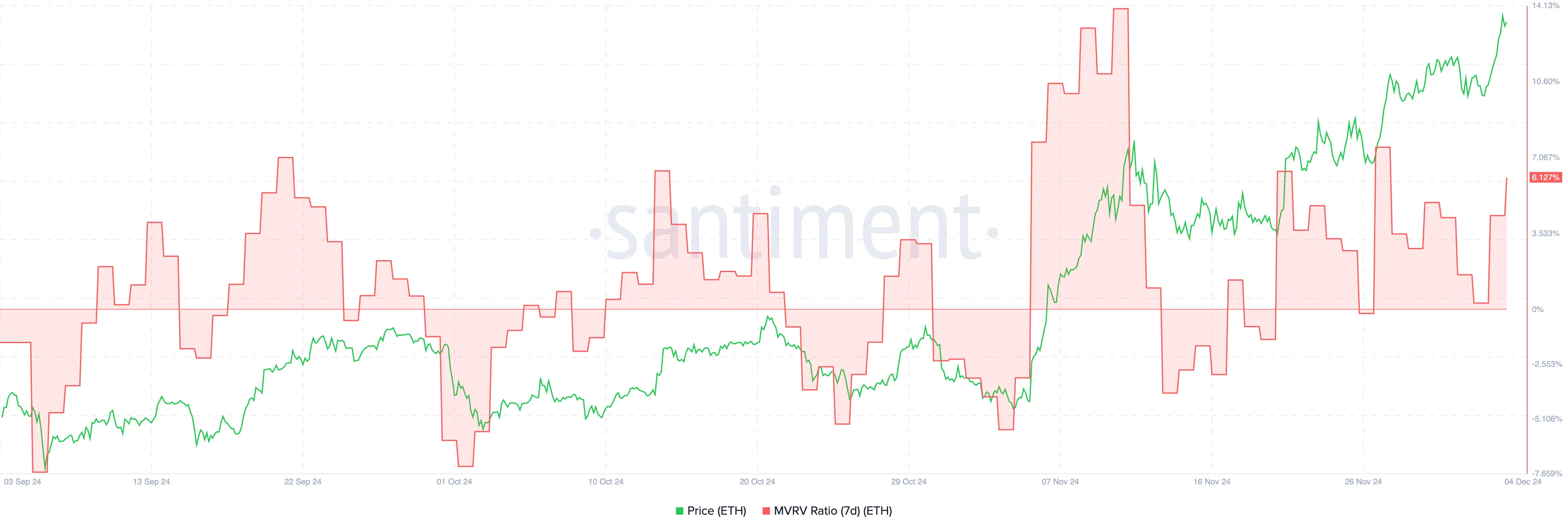7天MVRV已攀升至6.1%,较两天前的0.28%大幅上升。这一显著增长反映出短期持有者未实现利润的增加,表明市场乐观情绪高涨。历史数据显示,当ETH的7天MVRV接近这一水平时,往往会出现回调。