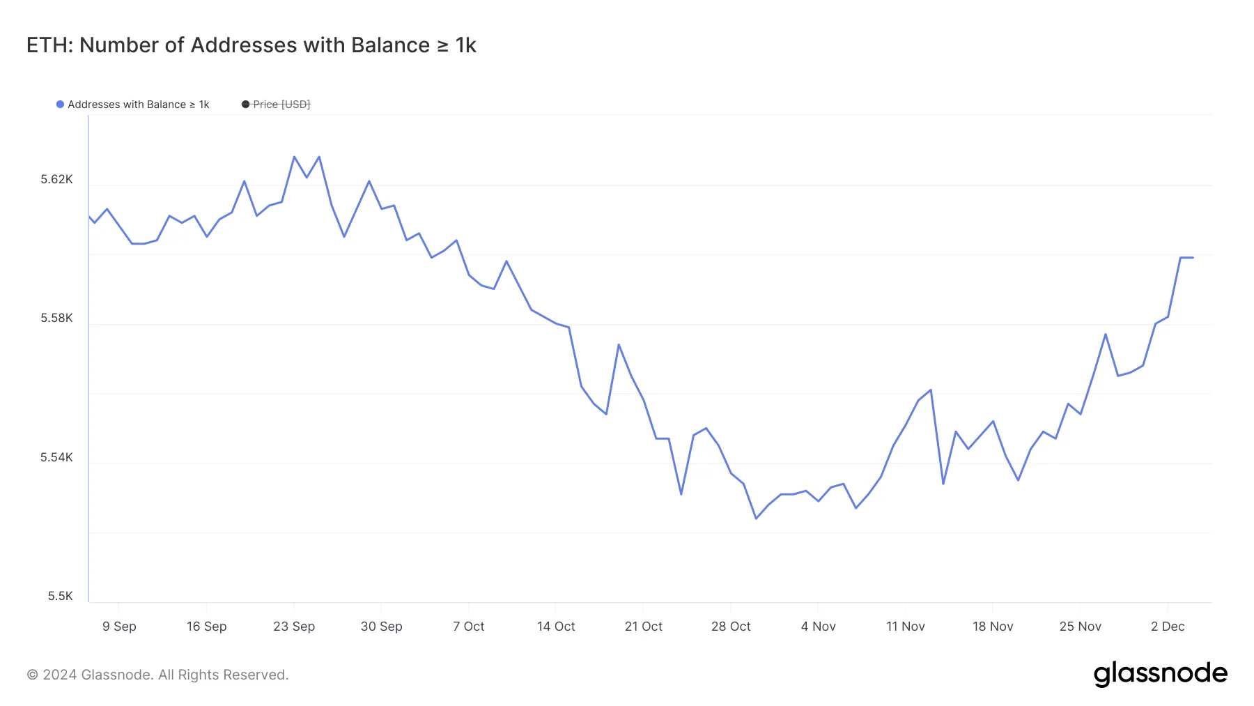 持有至少1000个ETH的钱包数量在10月30日降至三个月低点5524个,但此后趋势反转,显示出重新积累的迹象。截至11月3日,该指标已攀升至5599个,为10月6日以来的最高值。
