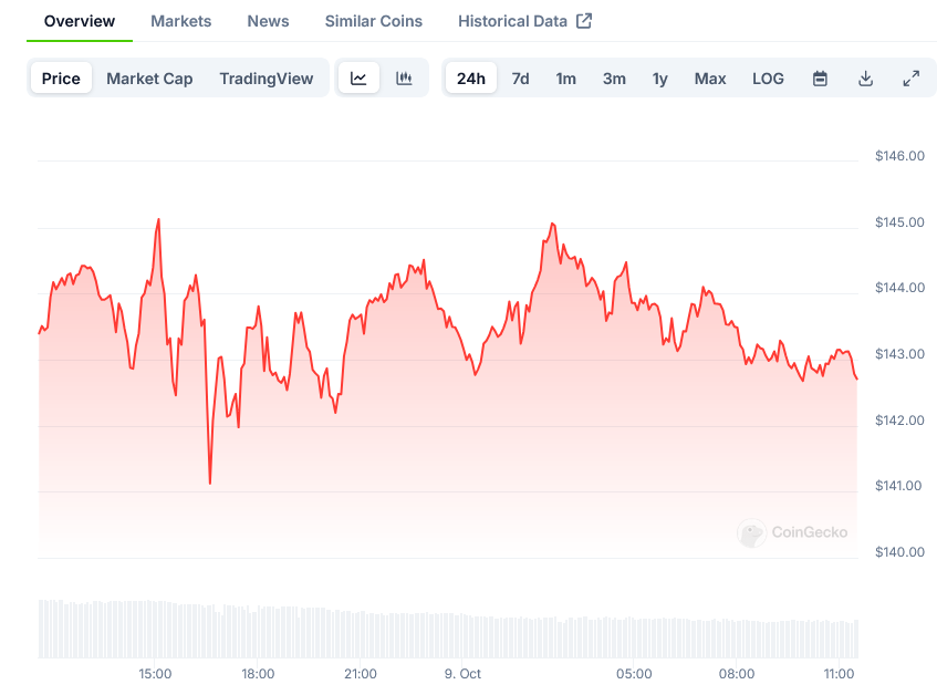 尽管有这些积极的发展和乐观的预测,Solana的当前价格表现相对平淡。报告发布时,SOL的交易价格为143美元,过去24小时下跌了2%。在同一时间段内,价格在149美元的高点和141美元的低点之间波动。