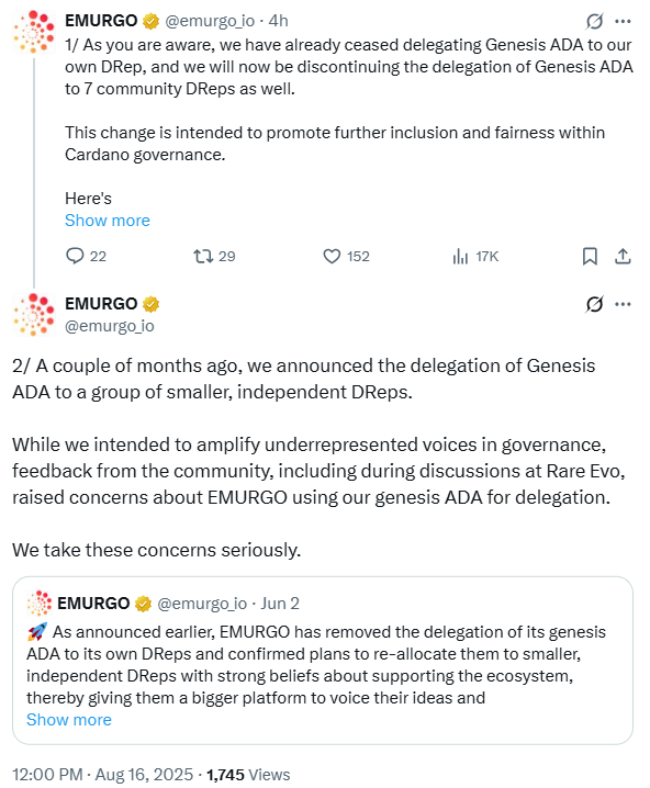 当前Genesis ADA将从七名DReps中撤出,未来可能转移或另作他用,但尚未公布新计划。EMURGO重申对构建透明、去中心化且广受信任治理模式的承诺。
