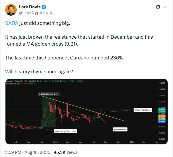 分析师Lark Davis指出ADA均线形成黄金交叉形态,并提醒历史类似形态后曾出现236%的价格飙升。