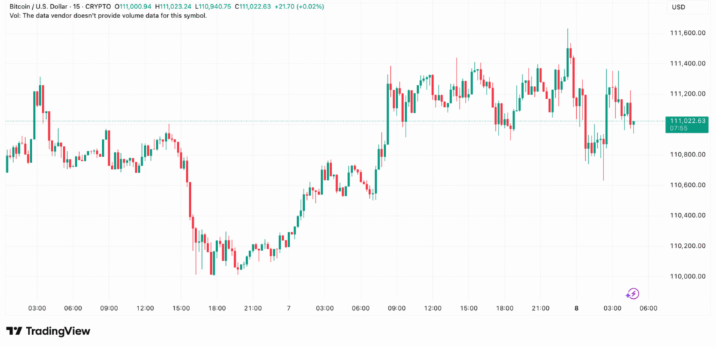 截至发稿,比特币现报111,022美元,微涨0.02%。15分钟图表显示剧烈波动,价格在110,940至111,600美元区间震荡。